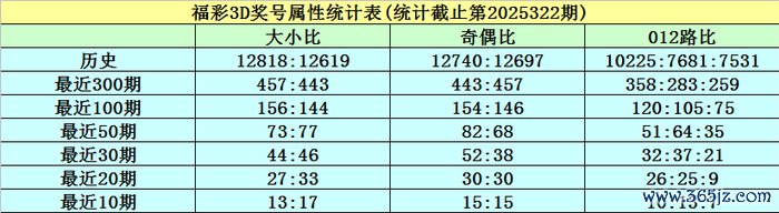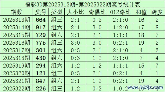 开奖总结:福彩3D第2025322期奖号为226,其中奖号大小比为1:2,奇偶比为0:3,012路比为1:0:2,和值为10,跨度为4。