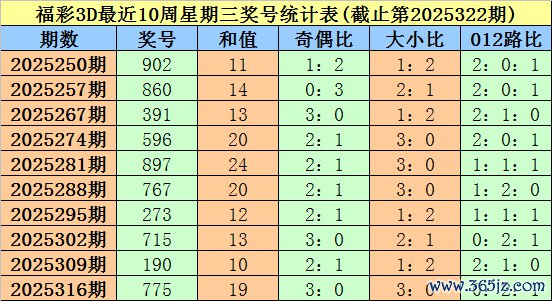 福彩3D第2025316期(上周星期三)奖号为775。其中奖号奇偶比为3:0,大小比为3:0,012路比为0:2:1。
